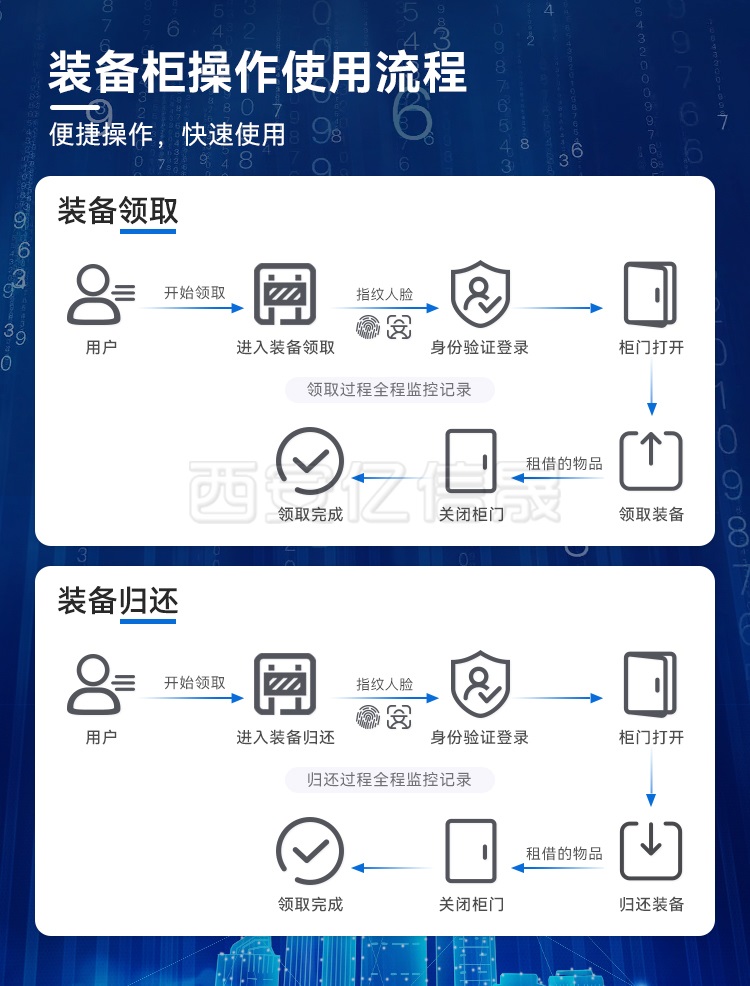 安全保障:智能装备存放柜配备了高级的安全措施,例如指纹识别、面部识别、密码输入等多重身份验证方式,确保只有授权人员可以访问柜内物品。这种安全措施能有效预防盗窃和未经授权的存取。